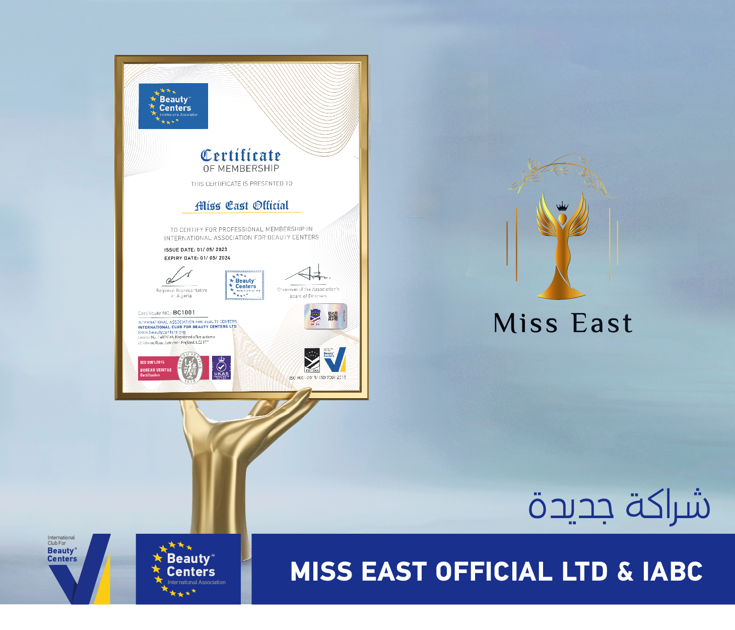 إيماناً منا بروح التعاون وأهمية ترسيخ العلاقات مع الكيانات المهمة والداعمة في مجال التجميل والجمال، يُسعدنا إعلامكم عن شراكتنا الاستثنائية مع شركة Miss East LTD أطلقنا هذه الشراكة لغاية الجمع بين قوتين هامتين في عالم الجمال والعناية به، لتحقيق تجربة لا مثيل لها في النهوض بعالم الجمال والتجميل، وبدعامة وأساس متينين بالاستعانة بروّاد وخبراء المجال. الجمعية الدولية لمراكز التجميل هي منظمة مرخّصة رائدة عالمياً في تعزيز معايير الجمال والعناية به، تجمع بين أفضل المراكز والمهنيين في عالم التجميل، وتلتزم بتعزيز الجودة والابتكار والتدريب في هذا المجال. والجدير بالذكر أن "Miss East LTD" هي شركة مرخّصة ومسجلة في بريطانيا، متخصصة بتنظيم الفعاليات والملتقيات والمعارض وغيرها من الفعاليات الثقافية والاجتماعية والاقتصادية والرياضية، على مختلف المستويات المحلية والإقليمية والدّولية، بما بتناسب مع المعايير المختلفة للمجتمعات وبما بتوافق مع معايير الجودة العالميّة. معاً لننشر الجمال ونعمل على تأصيل فكرتنا السّامية عنه، كلنا أمل وحماس للوصول لشراكة مثمرة وفعاّلة نحو تحقيق غاياتنا بأبهة وأنجح صورة. "إدارة الجمعية في الشرق الأوسط ودول الخليج العربي"